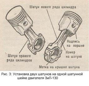 В двигателях на одной шатунной шейке коленчатого вала закреплено по два шатуна. Для правильной их сборки с поршнями нужно помнить, что шатуны правого ряда цилиндров собраны с поршнями так, что номер на шатуне обращен назад по ходу автомобиля (см. рис. 3), а левого ряда — вперед, т. е. совпадает с надписью на поршне.