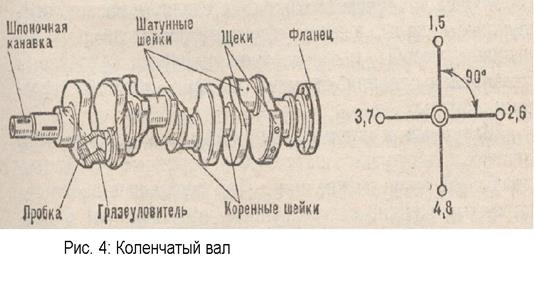 В восьмицилиндровых V-образных двигателях коленчатые валы имеют по четыре шатунные шейки, расположенные под углом в 90°.
