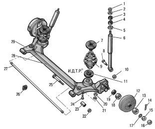 1 - гайка верхньої опори амортизатора; 2, 5, 21 - шайби; 3, 4 - гумові втулки; 6 - амортизатор; 7 - верхня прокладка пружини; 8, 24, 25 - болти, 9 - пружина задньої підвіски, 10, 20, 22 - гайки; 11 - нижня прокладка пружини; 12 - гальмівний барабан, 13 - зовнішній підшипник; 14 - шплінт; 15 - гайка; 16 - захисний ковпак, 17 - стопорна шайба; 18 - внутрішній підшипник; 19 - сальник; 23 - сайлентблок; 26 - подушки стабілізатора; 27 - стабілізатор; 28 - балка задньої підвіски; 29 - важіль підвіски.