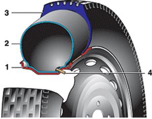 1 - обід колеса; 2 - камера, 3 - шина (покришка); 4 - вентиль.