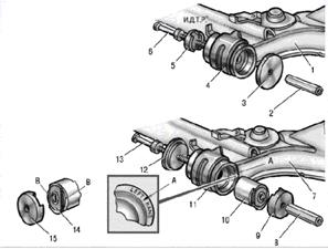 5. Перевіряємо резинометалеві шарніри (сайлентблоки) кріплення балки задньої підвіски до кронштейнів кузова.