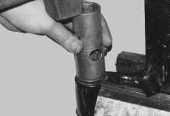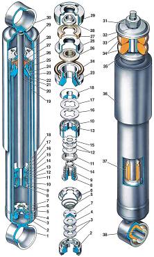 Зверху в циліндр встановлена напрямна втулка 23, яка ущільнена в резервуарі кільцем 24, а вихід штока - сальником 26 з обоймою 25. Всі деталі, розташовані у верхній частині циліндра, підгорнуті гайкою 29. У вушка амортизаторів запресовані резинометалличні шарніри 38.