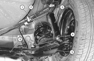 1 - верхня прокладка пружини, 2 - пружина задньої підвіски, 3 - амортизатор; 4 - нижня прокладка пружини; 5 - важіль задньої підвіски, 6 - балка задньої підвіски