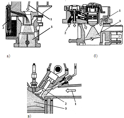 Рис. 1. Подача топлива при карбюрации (а), центральном (б) и распределенном (в) впрыскивании: 1 – воздух; 2 – топливо; 3 – горючая смесь