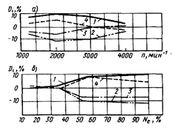 Рис. 2. Изменение степени неравномерности состава смеси по 1, 2, 3 и 4-цилиндрам в зависимости от частоты вращения n (полный дроссель) (а) и нагрузки (n=2000 мин-1 ) (б)