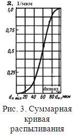 Для одновременной оценки мелкости и однородности распыливания пользуются характеристикой распыливания, представляющей собой зависимость между диаметрами капель dк и их относительным содержанием Ω – отношением объема капель, имеющих диаметры от минимального до данного, к объему всех капель. Зависимость Ω = f(dк ) приведена на рис. 3. Чем круче и ближе к оси ординат располагается суммарная характеристика распыливания, тем мельче и однороднее распылено топливо. Вместо указанных объемов по оси ординат можно откладывать относительную массу капель.