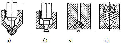 Рис. 7. Типы распылителей форсунок: а) цилиндрические; б) штифтовые; в) со встречными струями; г) с завихрителями