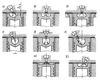 а) полусферическая типа дизелей ВТЗ; б) типа четырехтактных дизелей ЯМЗ и АМЗ; в) типа ЦНИДИ; г) типа дизелей "МАН"; д) типа "Дойтц"; е) типа дизеля Д-37М; ж) типа "Гессельман"; з) типа дизелей "Даймлер-Бенц"