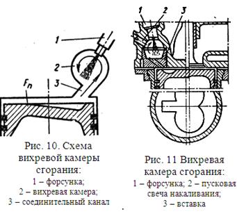 При поступлении воздуха из цилиндра в вихревую камеру во время такта сжатия воздух интенсивно завихривается. Воздушный вихрь, непрерывно воздействуя на формирующийся топливный факел, способствует лучшему распыливанию топлива и смешиванию его с воздухом. В ходе начавшегося горения воздушный вихрь обеспечивает подвод к факелу свежего воздуха и отвод от него продуктов сгорания. При этом скорость вихря должна быть такой, чтобы за время впрыскивания топлива воздух мог совершить в камере сгорания не менее одного оборота.