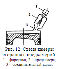 Предкамерные дизели. Объем предкамеры (рис. 12) составляет 25–35 % общего объема сжатия Vс . Площадь проходного сечения соединительных каналов равна 0,3–0,8 % площади поршня.
