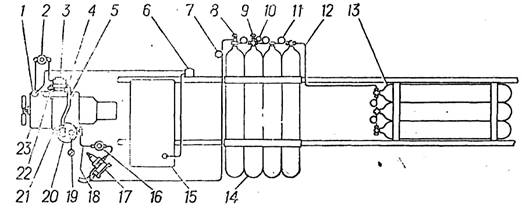 1-бензиновий насос; 2-фільтр тонкого очищення бензину з електромагнітним клапаном; 3-карбюратор-змішувач; 4-впускная труба; 5-шланг подачі газу в карбюратор-змішувач; .6-бензиновий відстійник; 7-трубка від балона до редуктора високого тиску; 8-видатковий вентиль; 9-наповнюючий вентиль; 10-манометр високого тиску; 11-трубка сполучна балонів; 12- трубка сполучна секцій; 13-задня секція балонів; 14-передня секція балонів; 15-бензиновий бак; 16-фільтр газу з електромагнітним клапаном; 17-редуктор високого тиску; 18-трубка від фільтра до редуктора низького тиску; 19-манометр низького тиску; 20-редуктор низького тиску; 21 - трубка забору вакууму; 22-трубка холостого ходу; 23-двигун.