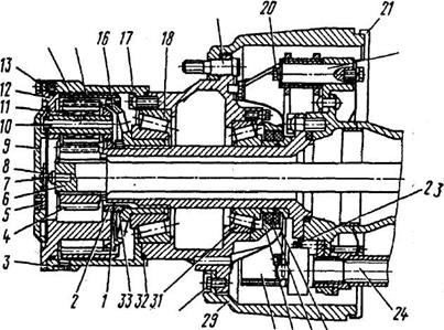 Рисунок 3- Колесная передача:1 - шайба; 2,33 - гайки; 3,5 - пробки; 4 - шестерня ведущая; 6 - полуось; 7 - сухарь; 8 - упор полуоси; 9 - крышка; 10, 22 - оси; 11 - подшипник игольчатый; 12 - водило; 13 - кольцо уплотнительное; 14 - сателлит; 15 - шестерня ведомая; 16,17- ступицы; 18 - подшипник; 19,20 - болты; 21 - щит; 24 - пружина; 24 - кулак разжимной; 25 - маслоуловитель; 26 - сальник; 27 - крышка сальника; 28 - колодка тормозная; 29 - барабан тормозной; 30 - болт, 31 - подшипник; 32 - кольцо уплотнительное