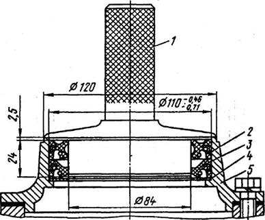 Рисунок 5- Оправка для запрессовки сальников в крышки среднего и заднего мостов:1 - оправка; 2, 3 - сальники; 4 - кольцо; 5- крышка