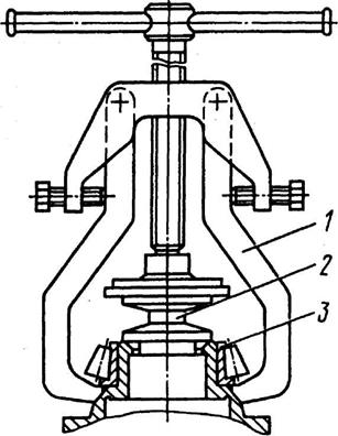 Рисунок 7- Снятие внутреннего кольца подшипника дифференциала: 1 - съемник; 2 - упор; 3 - кольцо подшипника внутреннее