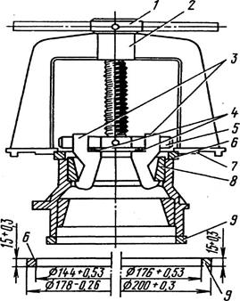 Рисунок 9- Снятие наружных колец подшипников ведущей шестерни среднего и заднего мостов:1- гайка; 2 - съемник; 3 - захваты; 4 - болты; 5 - скалка; 6, 9 - кольца; 7 - упор; 8 - кольцо подшипника наружное