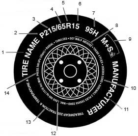 1 - Модель (имя) шины; 2 - Код транспортного средства; 3 - Ширина шины в миллиметрах от борта до борта; 4 - Отношение высоты борта к полной ширине шины в процентах; 5 - R направление корда; 6 – посадочный диаметр; 7 - Индекс нагрузки и знак скорости 8 - Идентификационный номер DOT в стандартах США; 9 – тип дорожного покрытия; 10 - Материал корда и композиция резины; 11 – Производитель; 12 - Максимальный индекс нагрузки; 13 - Код тяги, протектора, температурного сопротивления; 14 - Максимальное давление шины;