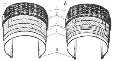 Рис. 4 - Покрышки диагональной (а) и радиальной (б) конструкции: