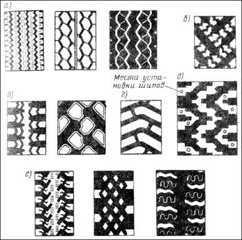 Зимний рисунок протектора (рис, 5, д) — это рисунок, где выступы имеют острые кромки. Шины с таким рисунком предназначены для эксплуатации на заснеженных и обледенелых дорогах и могут быть оснащены шипами противоскольжения;