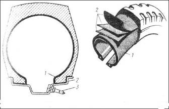 Бескамерная шина по внешнему виду почти ничем не отличается от стандартной автомобильной шины (рис. 6). Отличием от стандартных шин являются герметизирующий 1 (воздухонепроницаемый) слой по внутренней поверхности шины и уплотнительный слой 2 по наружной поверхности бортов.