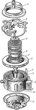 1 — передній підшипниковий щит, 2 — траверсу з щітковим апаратом, 3 — колектор, 4 — сердечник якоря, 5 — обмотка якоря, 6 — вентилятор, 7 — обмотка полюса, 8 — полюс, 9 — станина, 10 — дошка затисків, 11 — задній підшипниковий щит