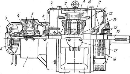 1 — станина збудника, 2 — колектор збудника, 3 — підшипниковий щит збудника, 4 — якір збудника, 5 — полюс збудника з обмоткою, 6 — шарикопідшипник, 7 — передній підшипниковий щит синхронної машини, 8 — станина синхронної машини, 9 — сердечник статора машини, 10 — обмотка статора машини, // — задній підшипниковий щит, 12 — полюс ротора з обмоткою, 13 — вентилятор, 14 — втулка, 15 — роликовий підшипник, 16 — вал ротора, 17 — коробка вивідних затисків, 18 — сітка на вентиляційному вікні підшипникового щита гвинта,