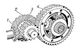 1 – ведущая коническая шестерня; 2 – ведомая коническая шестерня; 3 – ведущая цилиндрическая шестерня; 4 – ведомая цилиндрическая шестерня