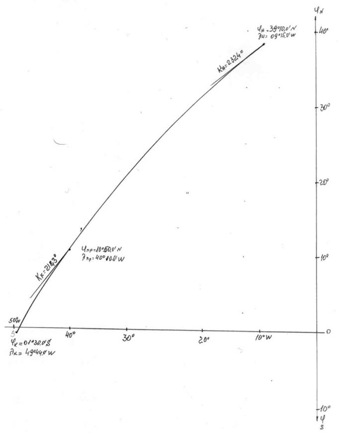 ЗАДАЧА № 5 Рассчитать по формулам плавание по ортодро-мии DopT, начальный курс Кн, конеч курс Кк, если судно совершило плавание из точки ( j1 , l1 ) в точку ( j2 , l2 ). Значение координат взять из своего варианта в задаче № 1. Выполнить рысунок.