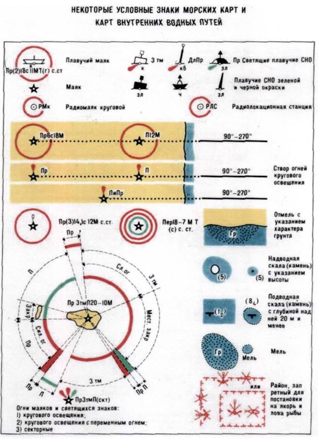 Перед тем как пользоваться картой, судоводитель обязан ее внимательно изучить. Для этого необходимо уметь правильно разбираться во всех условных обозначениях, нанесенных на карту, т. е. уметь читать карту. На советские МК все объекты нанесены условными знаками, грунты — сокращенными надписями, согласно помещенным в книге «Условные знаки морских карт и карт внутренних водных путей», изданной ГУНиО МО СССР в 1985 г. Некоторые извлечения из этой книги приведены на рисунке.
