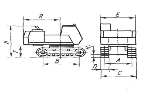 Колія екскаваторів, м База екскаватора, м Ширина, м: гусеничного хода гусеничної стрічки поворотної платформи Просвіт під поворотною платформою Висота випускної труби дизеля, м Просвіт під ходовою рамою (клиренс), м Радіус описаний хвостовою частиною поворотної платформи, м Експлуатаційна маса, т |