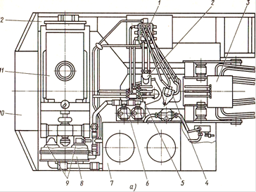 Гідрообладнання екскаватора ЭО-5123 складається з гідробака 7 (Рис.1.2, а), двох аксиально-поршневих насосів 9, реверсивних аксиально-поршневих гідромоторів (один для повороту платформи, два для пересування екскаватора), гідроциліндрів (по два для повороту стріли й рукояті й один для повороту ковша), гідророзподільників (1 і 3 для керування гідромоторами, гідроциліндрами й 5 регулюючий), центрального колектора 4, бака 6 фільтрів, оливоохолоджувача 8, трубопроводів і системи гідрокерування, що забезпечує необхідне функціонування силового гідрообладнання.