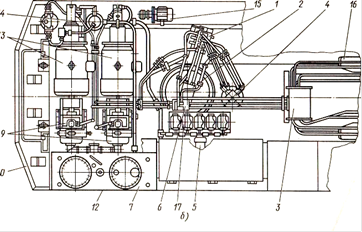 1,3,5 - гідророзподільники, 2 - гідромотор механізма повороту, 4 - центральний колектор, 6 - бак фільтрів, 7 - гідробак, 8 - оливоохолоджувач, 9 - насоси, 10 - противага, 11-дизель, 12-поворотна платформа, 13 - електродвигуни силової установки, 14 - трубопроводи, 15 - носос системи керування, 16-гідроциліндр стріли, 17 - установка радіатора