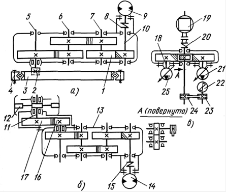 а - механизму повороту, б - механизму пересування, в - насосів силової установки; 1 - редуктор механизму повороту, 2 - шестерня, 3 - зубчастий венець, 4 - опорно-поворотне коло, 5-7, 10 - вали редуктора, 8, 15,20 - з’єднувальні муфти редуктора, 9 - гідромотор механизму поворота, 11 - вал ведучого колеса гусеничної стрічки, 12 - ведуче колесо, 13 - редуктор механизму пересування, 14 - гидромотор механизму пересування, 16, 17 - шестерня бортової передачи, 18 - раздатковий редуктор,19 - дизель, 21, 25 - насоси силової установки, 22 - вентилятор оливоохолоджувача, 23, 24 - шківи клинопасової передачі.
