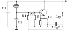 Кварцевый автогенератор является составной частью возбудителей, синтезаторов частот радиопередающих и радиоприёмных устройств, а также аппаратуры для частотных и временных измерений. Существует большое количество схем АГ, стабилизированных кварцевым резонатором. Их классифицируют на однокаскадные и многокаскадные. Однокаскадные АГ чаще всего строят по трехточечным схемам. Основное применение нашла схема ёмкостной трёхточки как наиболее надёжная и стабильная. Многокаскадные АГ содержат два или более активных элементов, а КР обычно включают в цепь обратной связи, что позволяет реализовать режим с малыми значениями мощности Ркв и долговременной нестабильности частоты. В осцилляторных схемах КР является элементом контура КАГ и играет в нём роль индуктивности. В таких схемах КР работает на частотах выше частоты последовательного резонанса, где его эквивалентная индуктивность достигает больших значений. Основным достоинством таких схем являются простота схемной реализации и малые значения относительной нестабильности частоты колебаний. Частоту задающего генератора с целью обеспечения её высокой стабильности выбираем порядка (1 - 10)МГц. В осцилляторных схемах контур КАГ выполняется с таким расчётом, чтобы при выходе из строя КР нарушалось условие самовозбуждения трёхточечной схемы автогенератора. Схема АГ: