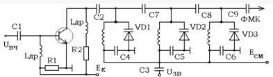 Следующим каскадом в нашем передатчике является фазовый модулятор, в котором ФМ осуществляется в контурах усилительного каскада путём управления его расстройкой с помощью модулирующего сигнала. В качестве управляемого реактивного элемента здесь используется варикап. Для увеличения индекса модуляции варикапы подключены ко всем контурам усилителя. Изменение резонансной частоты контура усилителя изменяет фазу высокочастотных колебаний в контуре в соответствии с его фазовой характеристикой. Схема имеет вид: