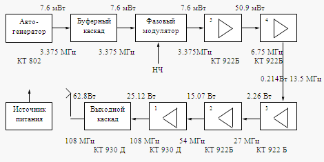 Для определения числа усилительных каскадов необходимо рассчитать колебательную мощность, отдаваемую АЭ выходного усилителя в максимальном режиме. Выбрав способ формирования заданного вида модуляции; определив принцип построения выходного каскада и тип применяемых в нём транзисторов; выяснив, что передатчик должен быть многокаскадным; решили вопрос о возможности применения типового возбудителя и необходимости разработки автогенератора: определили число умножения частоты. На основании этих данных есть возможность составить функциональную схему и определить общее число усилителей и других каскадов, типы транзисторов в них, необходимые питающие напряжения. Расчёт эскизного варианта структурной схемы проводится без детального расчёта режима каждого каскада на основе справочных данных о транзисторах. Эти данные позволяют подобрать несколько типов транзисторов, мощности и рабочие частоты, которые близки к требуемым для рассматриваемого каскада.