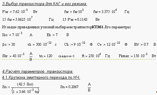 Приходится искать компромиссное решение, при котором можно получить приемлемые усилительные свойства АЭ и достаточно высокий КПД. Это компромиссное решение получается при выборе угла отсечки в окрестности 90 градусов. При этом электронный КПД становится близким к максимальному, Кр уменьшается всего лишь в два раза в сравнении с максимально возможным. Кроме того, минимизируется третья гармоника тока выходного электрода. Мы использовали ГВВ с включением транзистора по схеме с общим эмиттером.