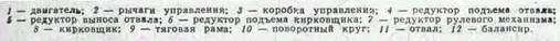 последний может заменяться бульдозерным отвалом. Отвал присоединяется к кронштейнам поворотного круга, который смонтирован на тяговой раме, присоединенной шаровым шкворнем к основной раме в передней ее части. Тяговая рама вместе с поворотным кругом и отвалом может подниматься и опускаться при помощи двух зубчато-реечных редукторов и выноситься вправо или влево при помощи червячно-реечного механизма. Отвал вместе с поворотным кругом может поворачиваться в плане в любую сторону на 360°. Привод к редукторам управления отвалом и кирковщиком осуществляется от коробки управления с помощью карданных валов.