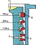 Рис. 1.5. Поршень та розподілення тиску газів на поршневі кільця: