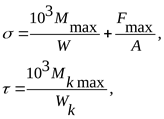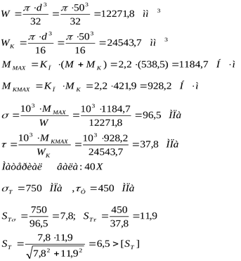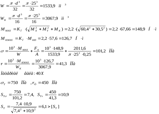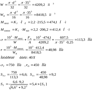 где Mmax – суммарный изгибающий момент, Mkmax=Tmax – крутящий момент, Fmax – осевая сила, W и Wk – моменты сопротивления сечения вала при расчете на изгиб и кручение, А – площадь поперечного сечения.