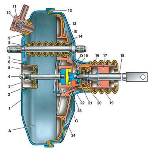 Резиновая диафрагма 12 вместе с корпусом 24 клапана делят полость вакуумного усилителя на две камеры: вакуумную А и атмосферную В. Камера А соединяется с впускной трубой двигателя через обратный клапан наконечника 11 и шланг.