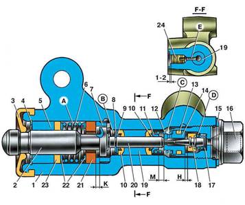 Корпус 24 клапана пластмассовый. На выходе из крышки он уплотняется гофрированным защитным чехлом 16. В корпусе клапана размещен шток 3 привода главного цилиндра с опорной втулкой, буфер 23 штока, поршень 15 корпуса клапана, клапан 21 в сборе, возвратные пружины 19 и 20 толкателя и клапана, воздушный фильтр 17, толкатель 18.