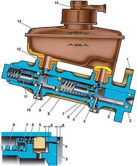 Главный тормозной цилиндр (рис. 5) с последовательным расположением поршней. На корпусе главного тормозного цилиндра крепится тормозной бачок 13, в наливной горловине которого установлен датчик 14 аварийного уровня тормозной жидкости. Уплотнительные кольца 5 высокого давления и кольца заднего колесного цилиндра взаимозаменяемы.