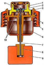 Датчик аварийного уровня тормозной жидкости механического типа. Корпус 2 (рис. 10) датчика с уплотнителем 4 поджимается к основанию 3 зажимным кольцом 5, которое навинчивается на горловину тормозного бачка. Одновременно к торцу горловины поджимается фланец отражателя 6. В этом положении зажимное кольцо удерживается двумя фиксаторами, изготовленными на основании 3. Через отверстие основания проходит толкатель 7, соединенный с поплавком 9 при помощи втулки 8. На толкателе расположен подвижный контакт 11, а на корпусе датчика - неподвижные контакты 10. Полость контактов герметизируется защитным колпачком 1. При понижении уровня тормозной жидкости в тормозном бачке до предельно допустимого подвижный контакт опускается на неподвижные контакты и замыкает цепь лампы аварийной сигнализации в комбинации приборов.