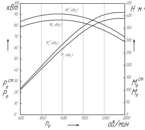 Скоростная характеристика может быть построена расчетным путем по эмпирическим зависимостям, либо по данным, полученным в результате стендовых испытаний двигателя. В данном курсовом проекте для получения скоростной характеристики мы используем эмпирические зависимости.