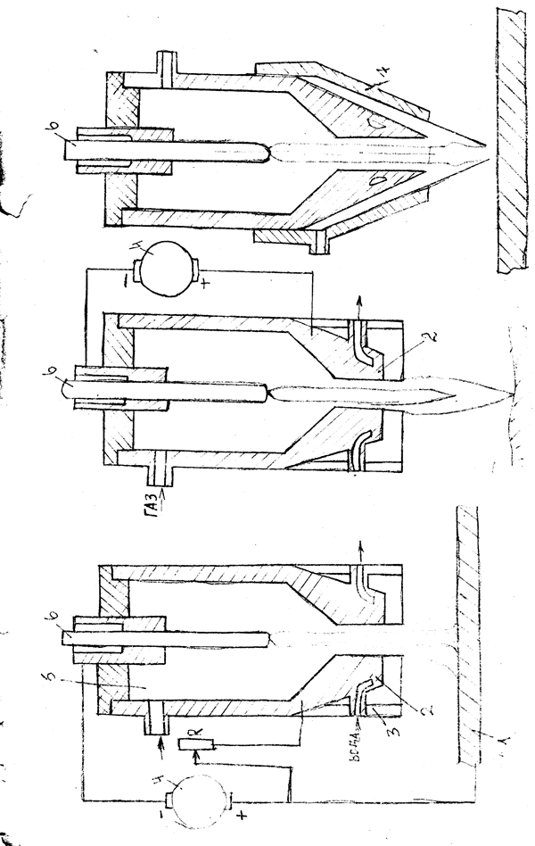Горелка комбинированного действия . Дуга горит – между неплавящемся вольфрамовым электродом и водоохлаждаемым каналом и между тем же электродом и деталью. Эта схема получила распространение при наплавке деталей порошком, вдуваемым в струю плазмы.