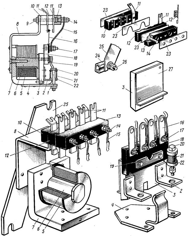 1 — контргайка; 2 — угольник; 3 — якорь; 4 — фигурная ограничительная скоба; 5 — катушка; 6 — сердечник; 7 — ярмо; 8 — держатель; 9 - винт; 10, 12, 13 — текстолитовые колодки; 11 — неподвижный контакт; 14, 17 — контактные болты; 15 — шунт; 16 — контактный палец; 18, 25 — планки; 19 — накладка; 20, 26 — болты; 21 — отключающая пружина; 22 — тарельчатая шайба; 23 — гетинаксовая прокладка; 24 — желобок; 27 — латунная пластинка