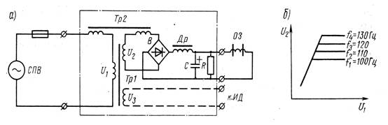 Напряжение от синхронного подвозбудителя СПВ подается на первичные обмотки трансформаторов Тр1 и Тр2 , включенные последовательно и согласно. Среднее значение напряжения вторичной обмотки U 2 трансформатора Тр1 зависит только от частоты питающего напряжения (рис.2б), так как сердечник этого трансформатора имеет прямоугольную петлю гистерезиса. Практически кривая намагничивания насыщающегося трансформатора из-за петли гистерезиса отклоняется от идеальной, вследствие чего образуются погрешности при изменении частоты. Для снижения погрешности применен трансформатор Тр2 ; вторичные обмотки Тр1 и Тр2 включены последовательно и встречно. Электродвижущая сила вторичной обмотки Тр2 компенсирует ту часть э.д.с. вторичной обмотки Тр1 , которая вызывается изменением намагничивающего тока при насыщении сердечника.