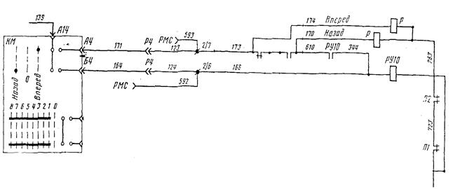 В положении «Назад» реверсивной рукоятки замыкаются первые снизу (с правой стороны) контакты реверсивного барабана, образуя цепь: контакты Б4 штепсельного разъема контроллера, провод 164, контакты штепсельного разъема Р4, провод 124, клемма 2/6, провод 166, катушка реле РУ10, общий минус. После включения реле РУ10 ток от плюсовой клеммы катушки реле по проводу 344, замыкающему контакту реле РУ10 и проводам 610 и 170 поступит в катушку вентиля «Назад» привода реверсора. От катушек вентилей ток по проводу 263, размыкающему контакту контактора П2, проводу 723, размыкающему контакту контактора П1, уходит на общею минусовую клемму 3/13.