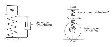 Читателю уже известно, что высокий статический прогиб рессорного подвешивания — одно из важных условий плавности хода тепловоза, т. е. малой чувствительности его к неровностям пути, особенно при высоких скоростях движения. Существуют другие способы (помимо описанных) увеличить гибкость рессорного подвешивания. На локомотивах, развивающих скорость свыше 100 км/ч, а также при повышенной нагрузке от оси на рельсы (более 250 кН/ось, или 25 тс/ось) устраивается двухэтажное, или, как принято говорить, двухступенчатое, подвешивание (рис. 4). Первая ступень размещается обычно между буксами колесных пар и рамой тележки, вторая между рамой тележки и кузовом. Благодаря смягчающему действию сначала первой, а затем второй ступени кузов получает более плавные колебания. Таким образом, вес кузова вместе с весом оборудования, находящимся в кузове, передается колесным парам через обе ступени рессорного подвешивания, а вес рамы тележки, включая часть веса тяговых электродвигателей при опорно-осевом их подвешивании и другого оборудования только через одну ступень. В результате общий статический прогиб двухступенчатого подвешивания значительно увеличивается по сравнению с одноступенчатым. Однако двухступенчатое подвешивание все же усложняет конструкцию локомотива. На отечественных локомотивах в основном применяется одноступенчатое подвешивание.