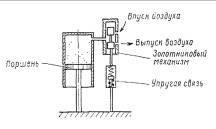 При увеличении нагрузки Q кузова, т. е. при сжатии пневморессоры, в баллон дополнительно впускается сжатый воздух, а при ее распрямлении — выпускается. Благодаря изменению давления внутри пневматической рессоры высота ее под статической нагрузкой локомотива, передающейся от веса подрессоренных частей, поддерживается практически постоянной. Механизм, предназначенный для компенсации утечек воздуха, должен срабатывать только при значительном статическом прогибе рессор (например, при проходе стыков рельсов, стрелочных переводов), а при обычных (небольших) колебаниях тепловоза он срабатывать не должен. Такие быстро протекающие колебания кузова и рамы должны поглощаться резиновыми элементами, которые для этого последовательно включаются в рычажный привод высоторегулирующего механизма. Стоит же вертикальным колебаниям превысить допускаемую величину (амплитуду), на которую рассчитаны резиновые элементы, как в действие вступает уже сам высоторегулирующий механизм, автоматически открывающий или закрывающий доступ воздуха в рессору.